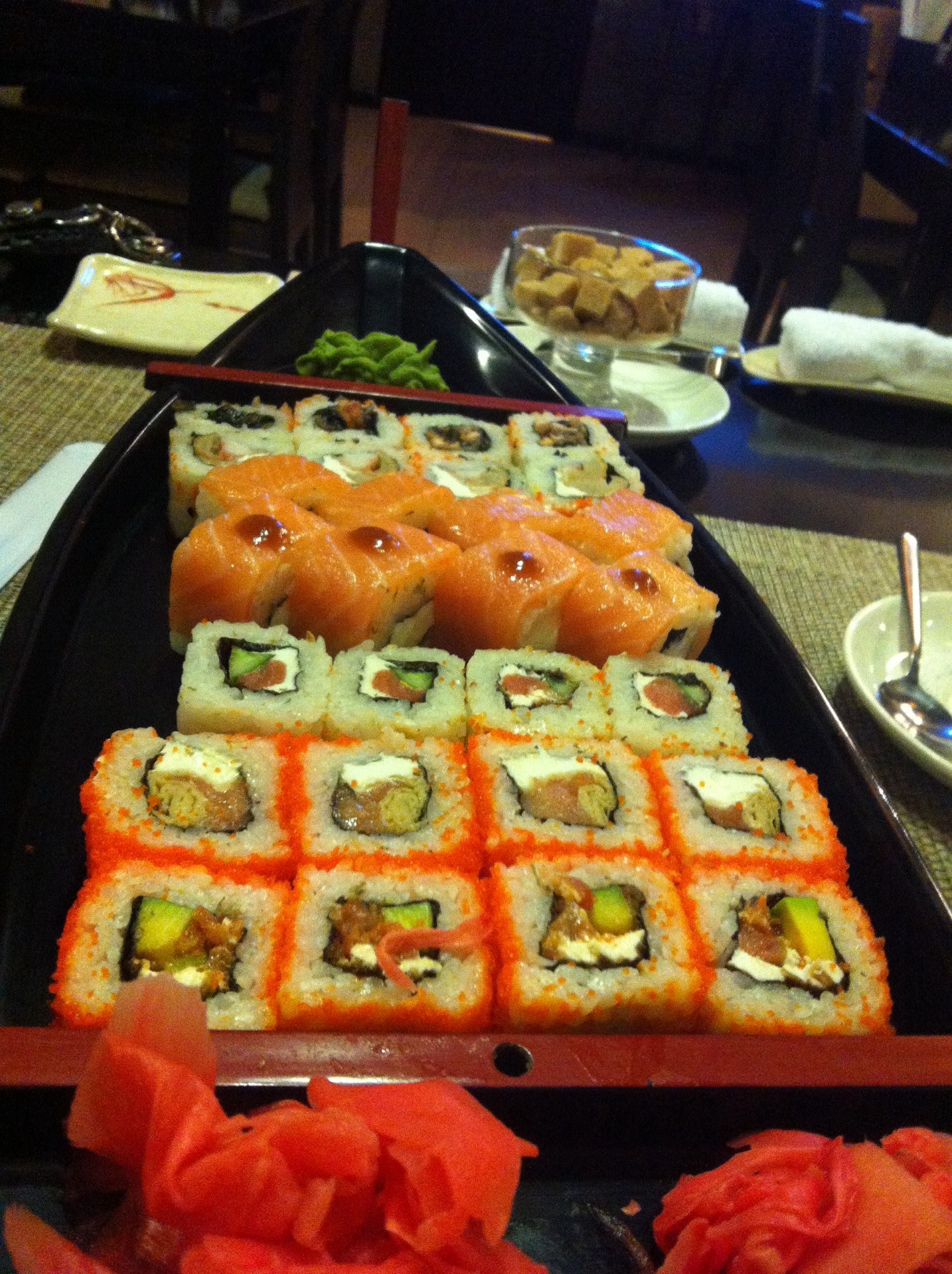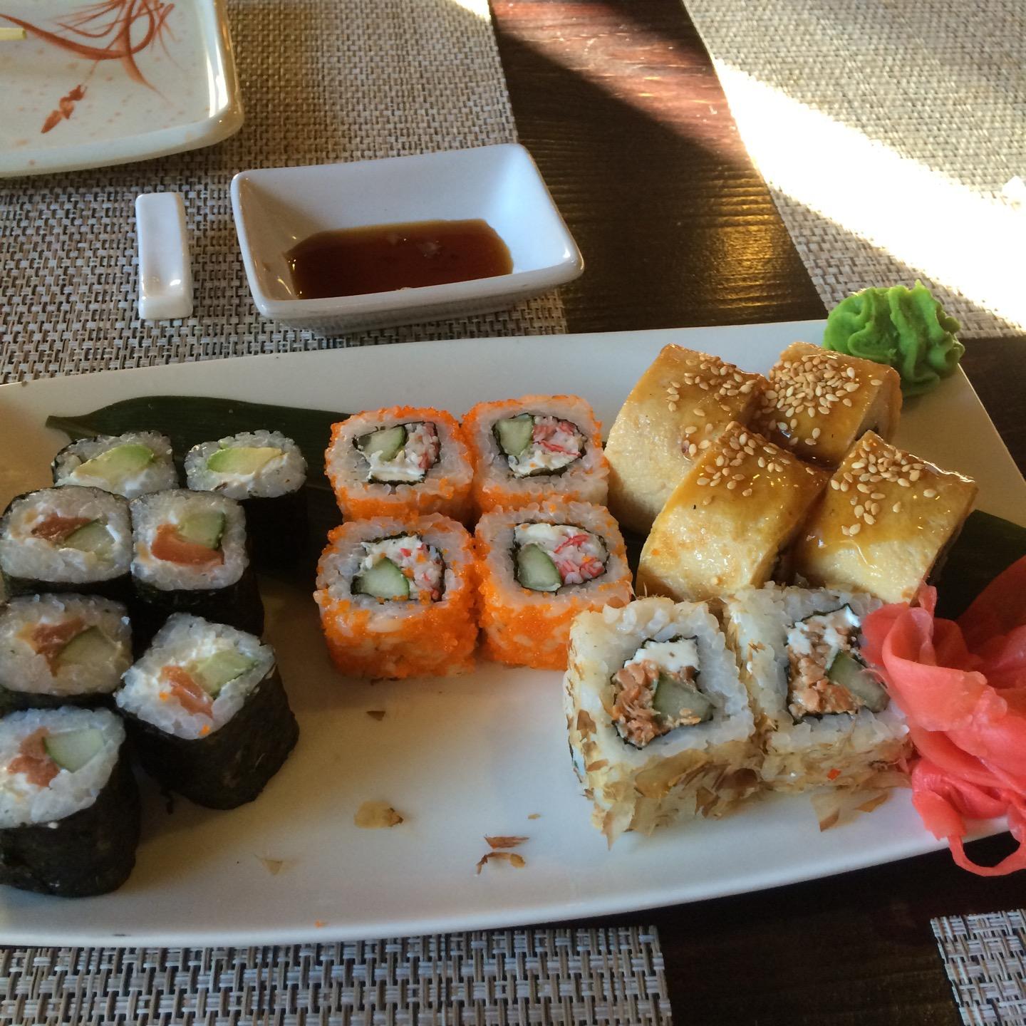 Заказали сет Окинава из спец.предложения ожидали большего. Не вкусный. Десерт сырное парфе очень нежный, понравился ) п.с. Темные полы надо почаще мыть, грязные следы обуви везде